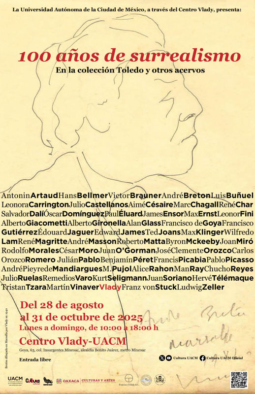 El primer manifiesto surrealista que el visitante de esta exposición en el Centro Vlady encontrará en sus patios, impulsó un movimiento artístico que apeló a la libertad del ser humano por medio de liberar la imaginación, el arte y la estética bajo diversos métodos que ayudarán a desarticular los parámetros prestablecidos, estimulando el subconsciente mediante diversas estrategias que iban desde la escritura o la pintura automática, la exploración de substancias psicoactivas, la aplicación de algunos hallazgos del picoanálisis de Freud en la literatura, el cine y el arte, la irrupción del azar como rasgo disrruptor, el ludismo técnico mediante el frotage, el fumage, el collage, el gratage y otras técnicas, las acciones artísticas como happenings o performance, e incluso las instalaciones y el arte objeto, mismos que se irían inventando o aplicando en los años de desarrollo de esta vanguardia. Casi todos los artistas plásticos importantes y los escritores de esa época tuvieron o una influencia del surrealismo o una época surrealista maravillados por las propuestas del movimiento, que tuvo como base al Dadaísmo, mucho más radical pero también más críptico en su feroz crítica a la decadencia de una Europa destruida por la Primer Guerra Mundial.